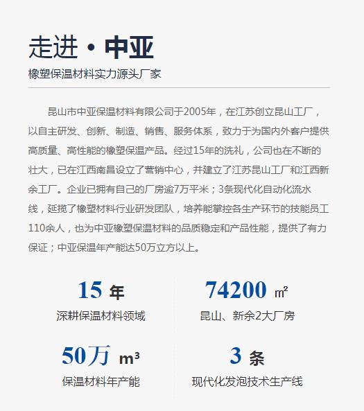 昆山市中亞保溫材料有限公司-中亞保溫材料有限公司是集研發(fā)、生產(chǎn)、銷售橡塑保溫材料、橡塑保溫管材、橡塑保溫板材、復(fù)合橡塑保溫材料、殼護(hù)保溫外護(hù)材料為一體的集團(tuán)企業(yè)。