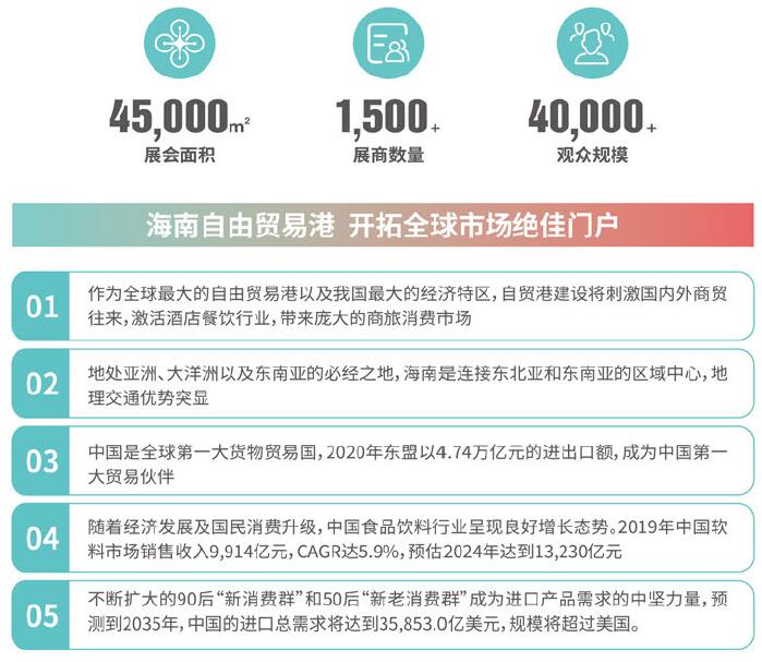 海南國(guó)際飲品博覽會(huì),立基海南、面向全球,致力于為飲料及餐飲連鎖加盟企業(yè)進(jìn)駐海南自貿(mào)港,開(kāi)拓在中國(guó)以及東盟市場(chǎng)的商貿(mào)業(yè)務(wù)。展會(huì)通過(guò)新品展示,資訊分享,趨勢(shì)洞察、資源對(duì)接的一站式服務(wù)為供求雙方搭建專業(yè)的商貿(mào)平臺(tái),助力企業(yè)快速進(jìn)駐自貿(mào)港,搶占食飲新商機(jī)。