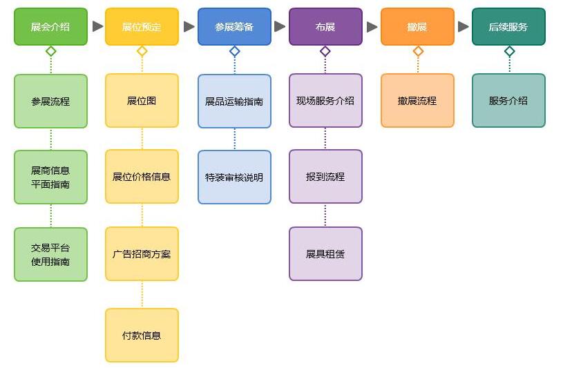 預(yù)訂展位/準(zhǔn)備展品——交付展位預(yù)訂金——確認(rèn)展位——交付展位余款及人員款項(xiàng)——辦理出國(guó)簽證手續(xù)/展品運(yùn)輸——國(guó)內(nèi)集中出發(fā)——國(guó)外參展/考察——回國(guó)